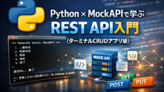 python Python × MockAPIで学ぶREST API入門(ターミナルCRUDアプリ編) 次回は、この API をさらに別の言語や UI から操作してみるのも面白いだろう。API は一度作れば、使い方次第で何通りもの学び方ができる。ぜひ手元で改造しながら試してほしい。 2026.01.08 python