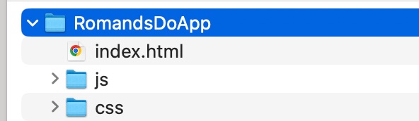 好きな場所に新規にフォルダを作成し(RomandsDoApp)その中にcssフォルダ、JSフォルダ、index.htmlを作成します。